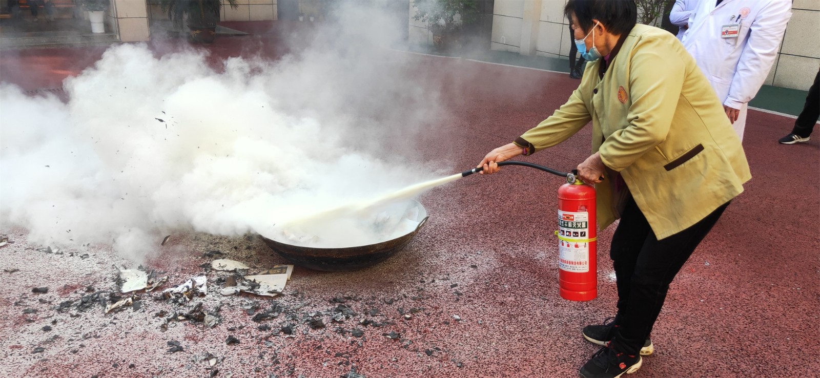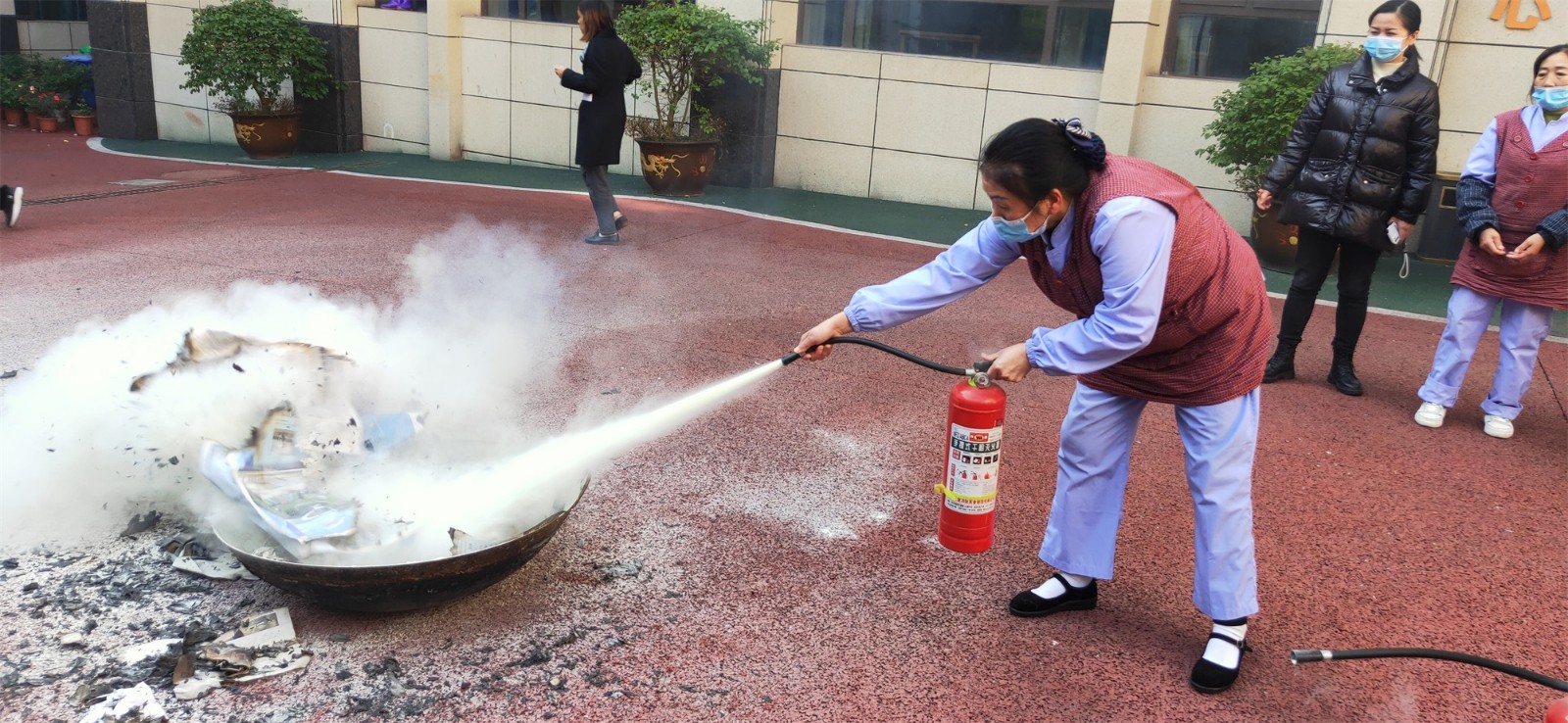 向養(yǎng)護(hù)中心工作人員介紹常用手提式干粉滅火器的組成、判定滅火器時(shí)候處于正常狀態(tài)下的方法,使用滅火器的方法,并指導(dǎo)工作人員使用滅火器。