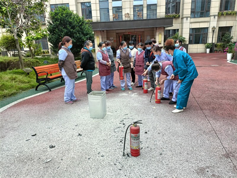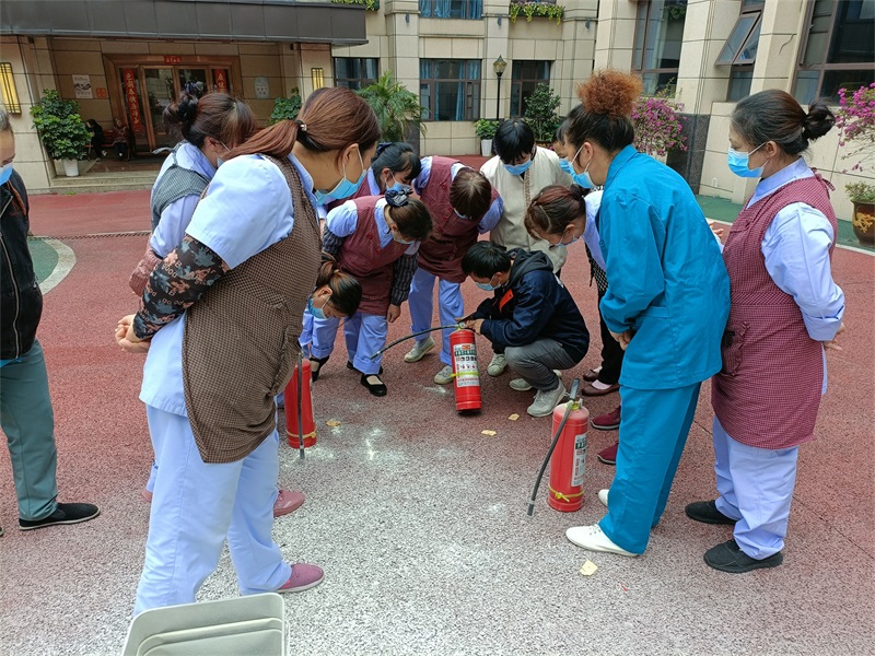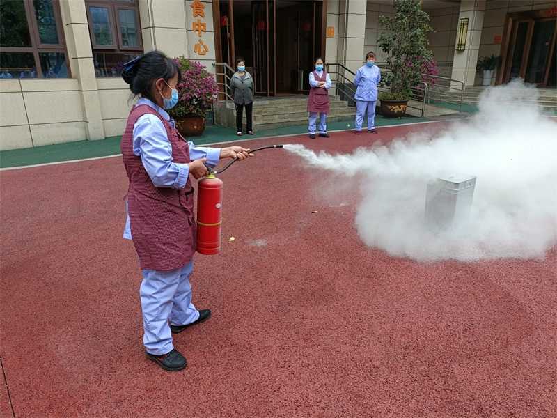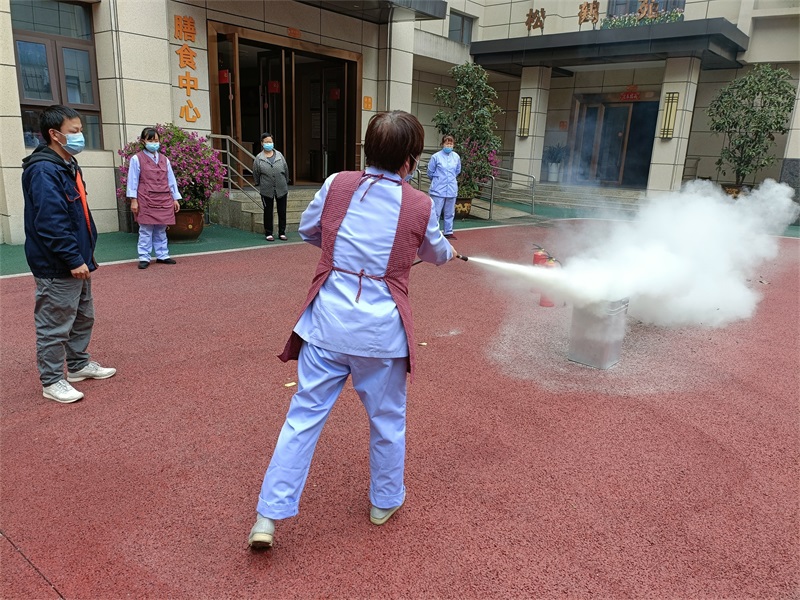 老師把滅火器的使用方法歸納為:一提、二拔、三瞄、四壓。待鶴鳴山老年養(yǎng)護(hù)中心的工作人員掌握了使用技巧,隨后在老師的示范下,一個(gè)一個(gè)親自上場(chǎng)演示了滅火器的使用方法。