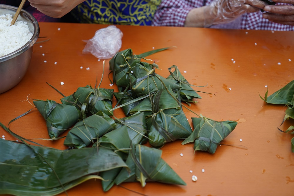 整個(gè)活動(dòng)現(xiàn)場(chǎng)歡聲笑語(yǔ)、其樂(lè)融融,折粽葉、裝糯米、裹緊扎繩,經(jīng)過(guò)快、準(zhǔn)、巧的包扎,一個(gè)個(gè)飽滿漂亮的粽子***成型了,老人們個(gè)個(gè)都有一雙巧手,包粽子既快又好。